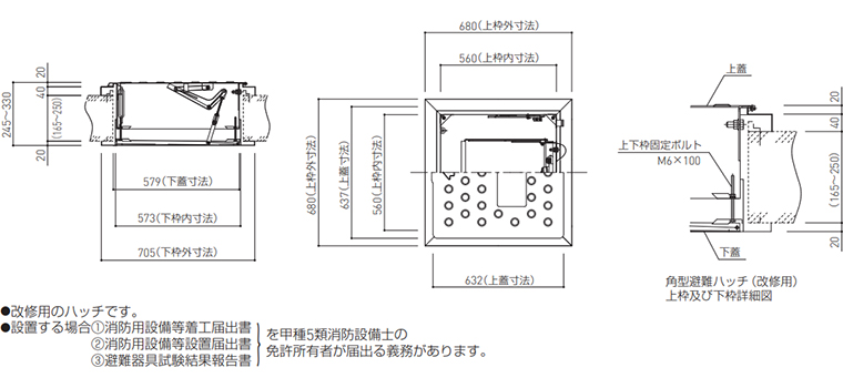 - 改修用ハッチの上枠、下枠を上下それぞれから古くなったハッチの内側に差し込んで(サンドイッチ状)四隅をボルトによって固定して下さい。