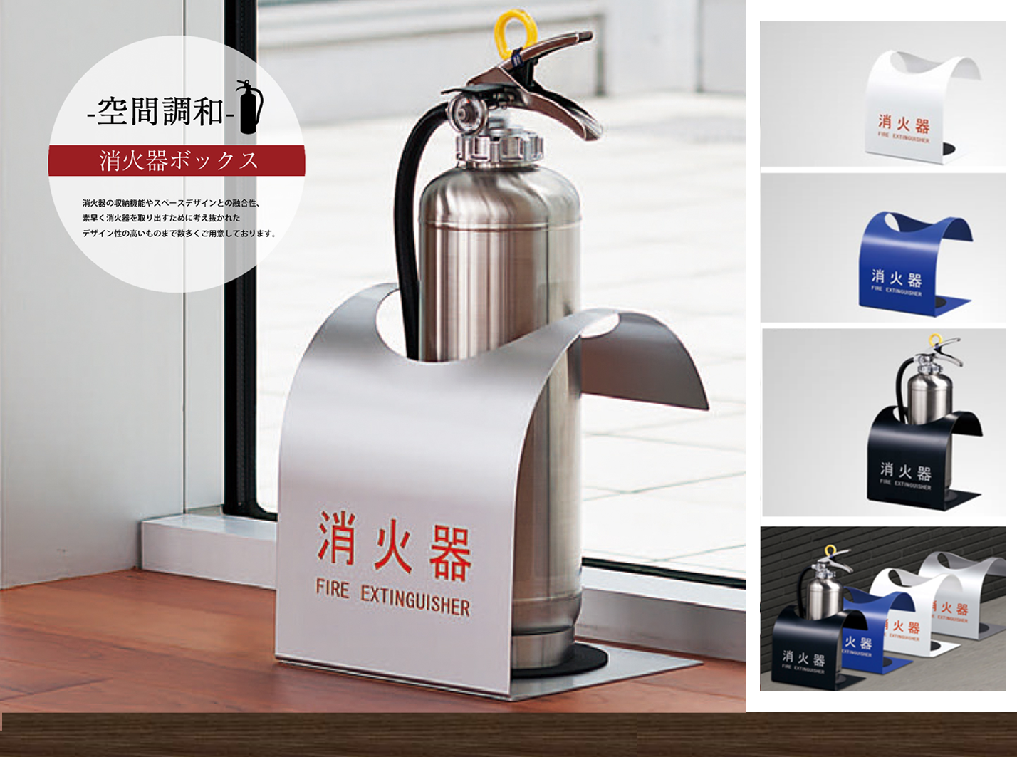 消火器の収納機能やスペースデザインとの融合性、素早く消火器を取り出すために考え抜かれたデザイン性の高いものまで数多くご用意しております。